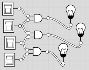A computer is a big ole’ pile of switches. Imagine an on/off switch connected to a bulb: