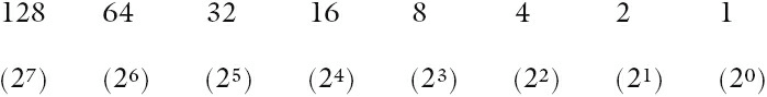 The BINARY SYSTEM is based on the number 2. Therefore, only the two ‘values’ 0 and 1 can be used to represent each digit. Using the same method as denary, this implies headings of 20, 21, 22, and so on. The typical headings for a binary number with eight digits would be: