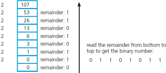 Consider the conversion of the denary number, 107, into binary. This method