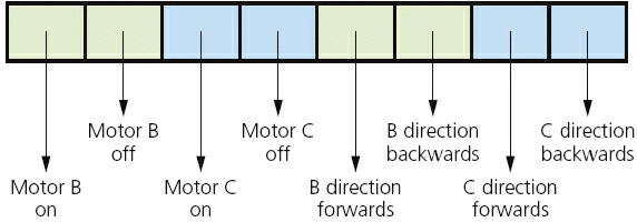 we can see that each “bit” would do something different in the system. The particular string of bits 10101001 above would, therefore, turn on motor B and C ON, it would then rotate B forwards and C backwards effectively turning the robot.